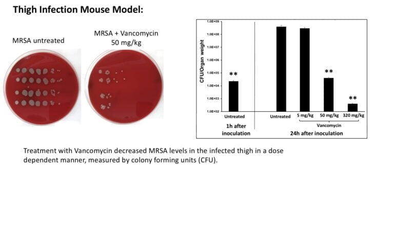 - Standard assessments: Body weight, clinical signs, survival, microbial burden determination (CFU), Histology.